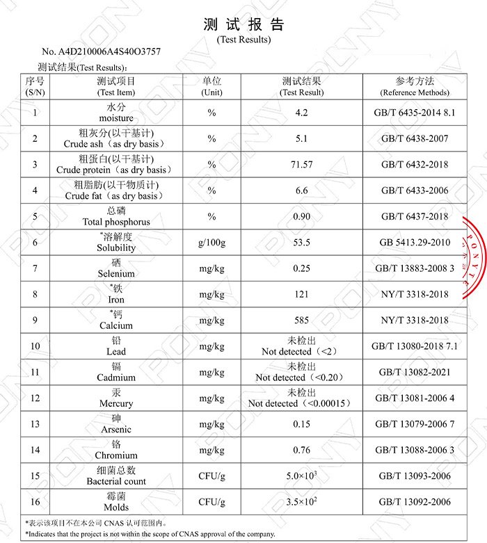 Rich in protein (73%), fat(4%), 18 kinds of amino acids, phosphorus, iron, potassium, sodium, vitamins and other trace elements necessary for animal growth.